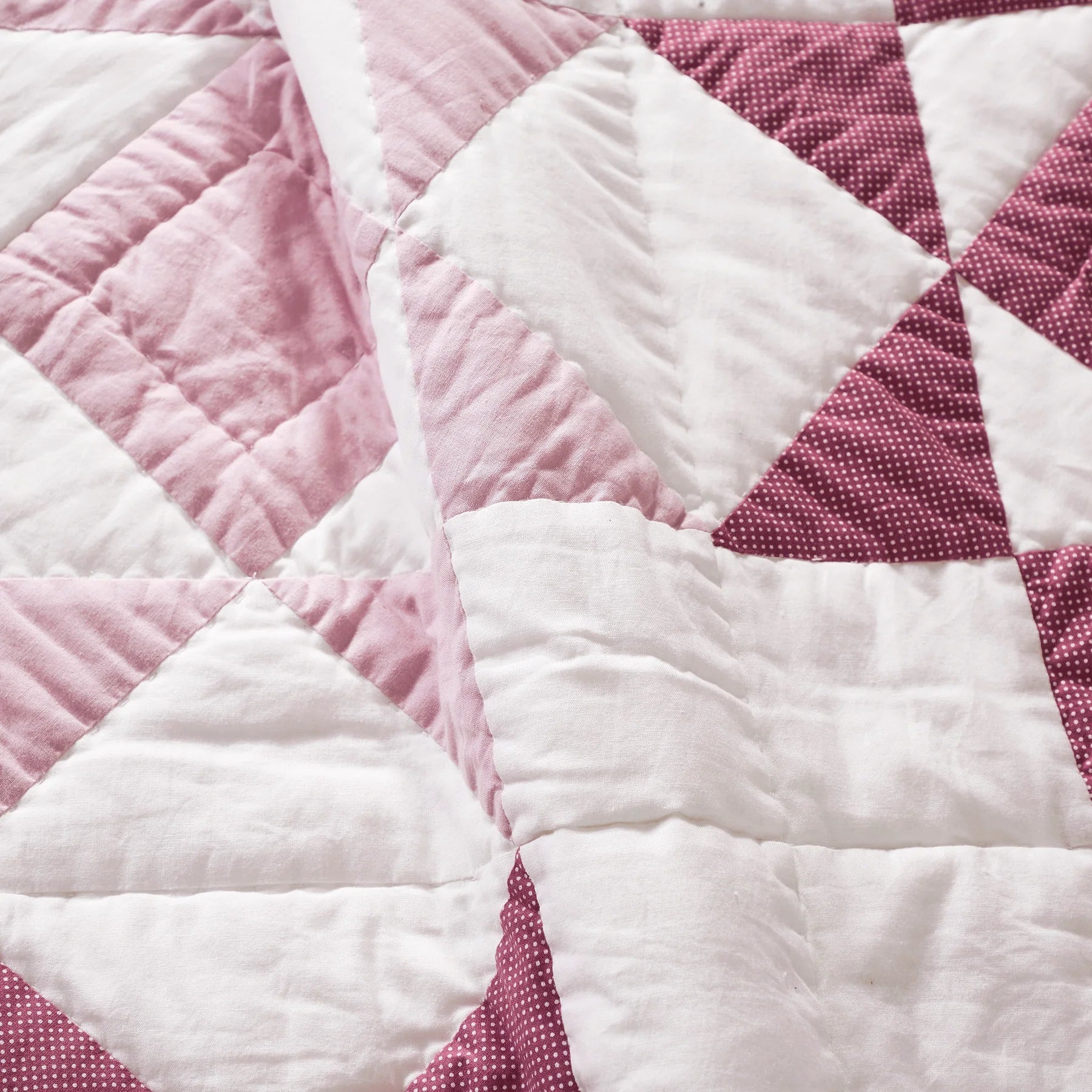 A modern take on the iconic sawtooth star quilt block, this organic cotton patchwork throw is hand quilted by skilled artisans. The antique-inspired design features lilac and magenta stars with a playful pin dot pattern. Fully reversible, the quilt backing showcases our original Abigail floral print. The quilt is finished with a playful scalloped binding. Use it to cozy up on the sofa or style it folded at the foot of a twin, full, or queen bed. Comes packaged in an organic cotton Abigail print drawstring bag that we encourage you to reuse!